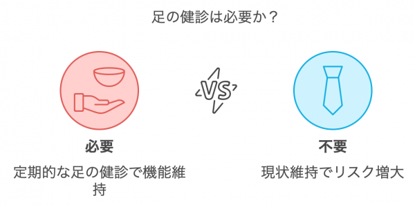 多くの高齢者が足の機能低下に悩んでいます。これは、足に関する知識を十分に学ぶ機会が少ないことや、足の健診制度がないためです。「食べること」が生命維持に欠かせないと認識されているように、「歩くこと」も同等に重要です。私たちは、歯科検診と同じように、定期的な「足の健診」が必要であると考えています。